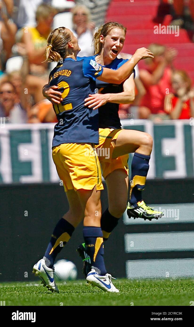 Australia S Ellyse Perry R Celebrates Her Goal Against Sweden With Teammate Emily Van Egmond During Their Women S World Cup Quarter Final Soccer Match In Augsburg July 10 2011 Reuters Kai Pfaffenbach Germany Tags