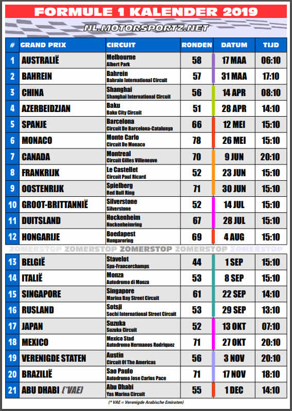 Seizoen 2020 telt zoals verwacht 22 Grands Prix waarvan die van Nederland de vijfde is en op 3 mei wordt gehouden. Op die plek zou de Grand Prix van Vietnam voor het eerst te. Download de Formule 1-kalender 2020.